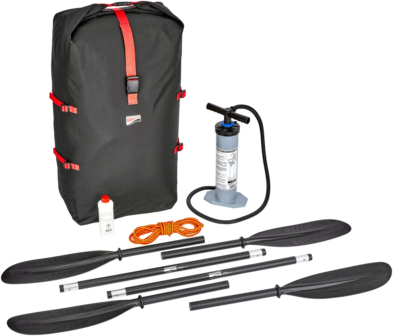 De Outside-Kanadier accessoireset combipaddle is geschikt voor de volgende Grabner boten: XR Trekking, Buiten, Indio, Adventure, Adventure, Adventure SL en Speed. Het bevat een luchtpomp met manometer, twee dubbele peddels, een pakzak, een 5 m lange bootlijn en een liter bootverzorgingsproduct.