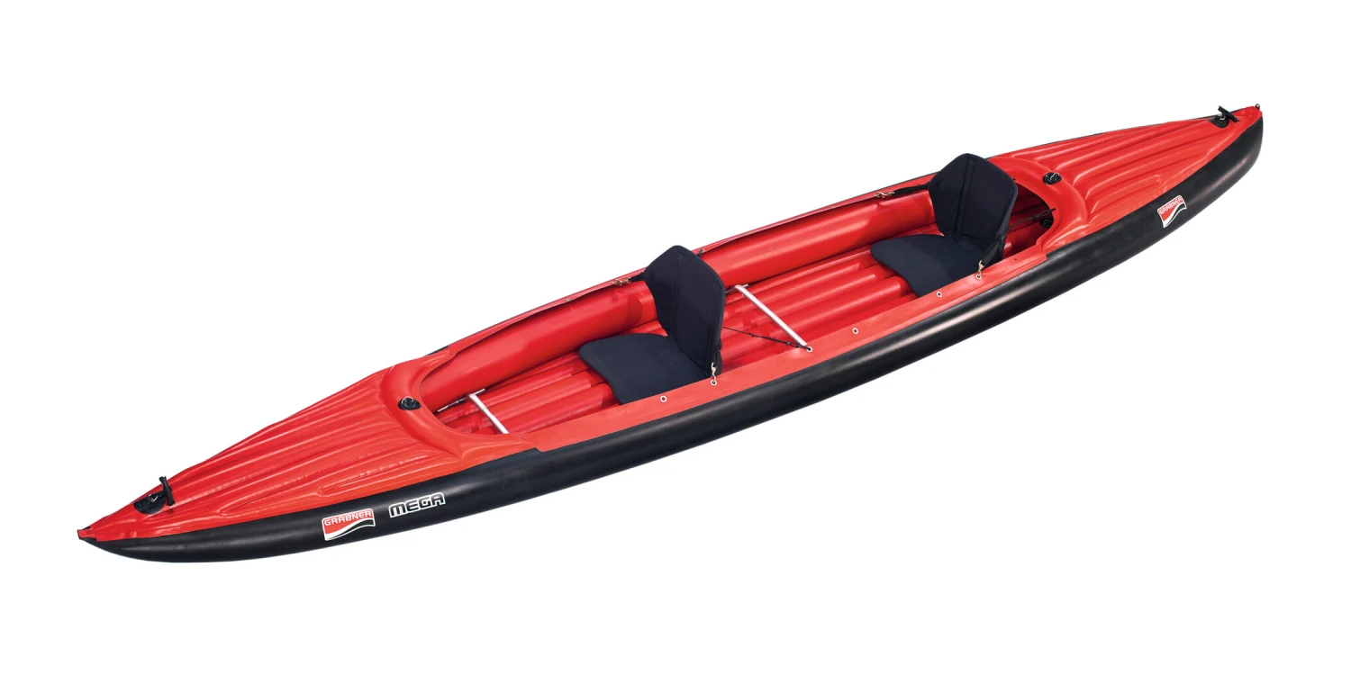 Nieuwe supercomfortabele reiskayak voor 1 of 2 volwassenen of 2 volwassenen + 1 peuter. Soepele loop door lange rek, onovertroffen kantelstabiliteit door grote breedte. De comfortabele stoelen met hoge rugleuning zijn traploos in lengte en helling verstelbaar. Nog zwaardere mensen voelen zich volledig comfortabel en veilig in de Mega. Voor comfortabel peddelen op rivieren, meren, zee en tot aan het witte water. Ideaal voor aandrijving met elektromotor.