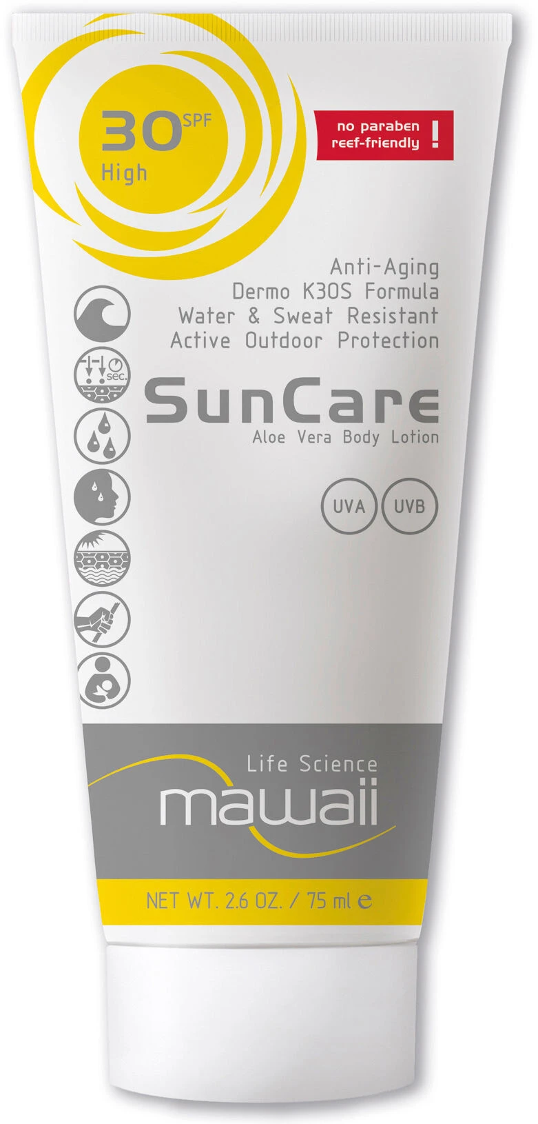 Mawaii SunCare is een zeer effectieve bodylotion die speciaal is ontwikkeld voor de buitensport. Het verzorgt, beschermt, wordt snel geabsorbeerd, is water- en zweetbestendig en laat geen smeerfilm achter. Dermo K3OS Formula beschermt de huidcellen tegen UV-straling, luchtvervuiling en vrije radicalen. Het is geschikt voor alle leeftijden en huidtypen, en prikt niet in de ogen.